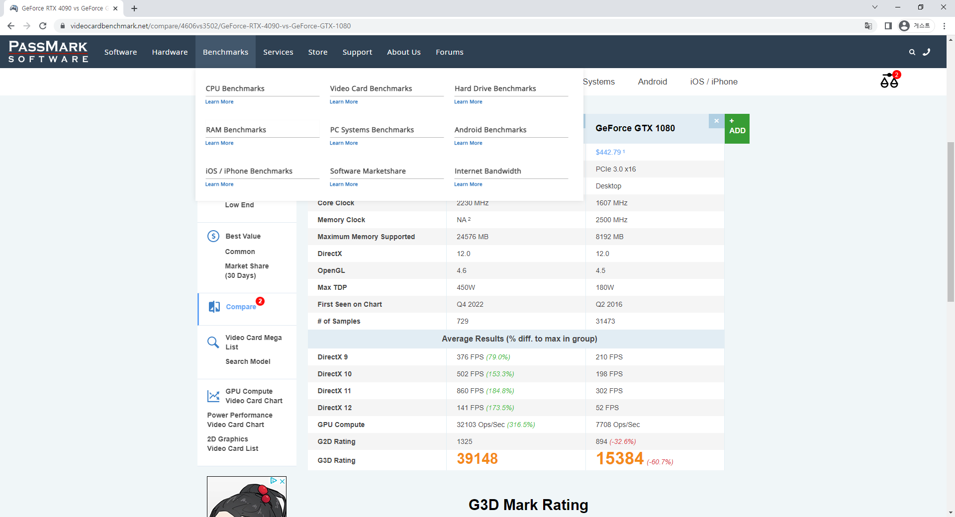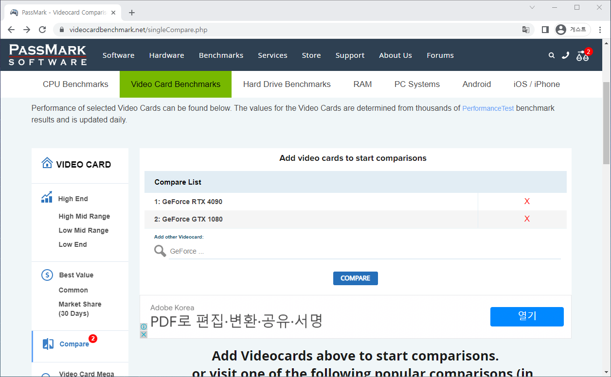 그래픽카드 랭킹과 각종 밴치마크 점수들을 확인할 수 있다.