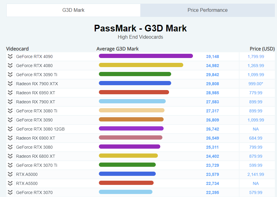 Performance of selected Video Cards can be found below. The values for the Video Cards are determined from thousands of PerformanceTest benchmark results and is updated daily.