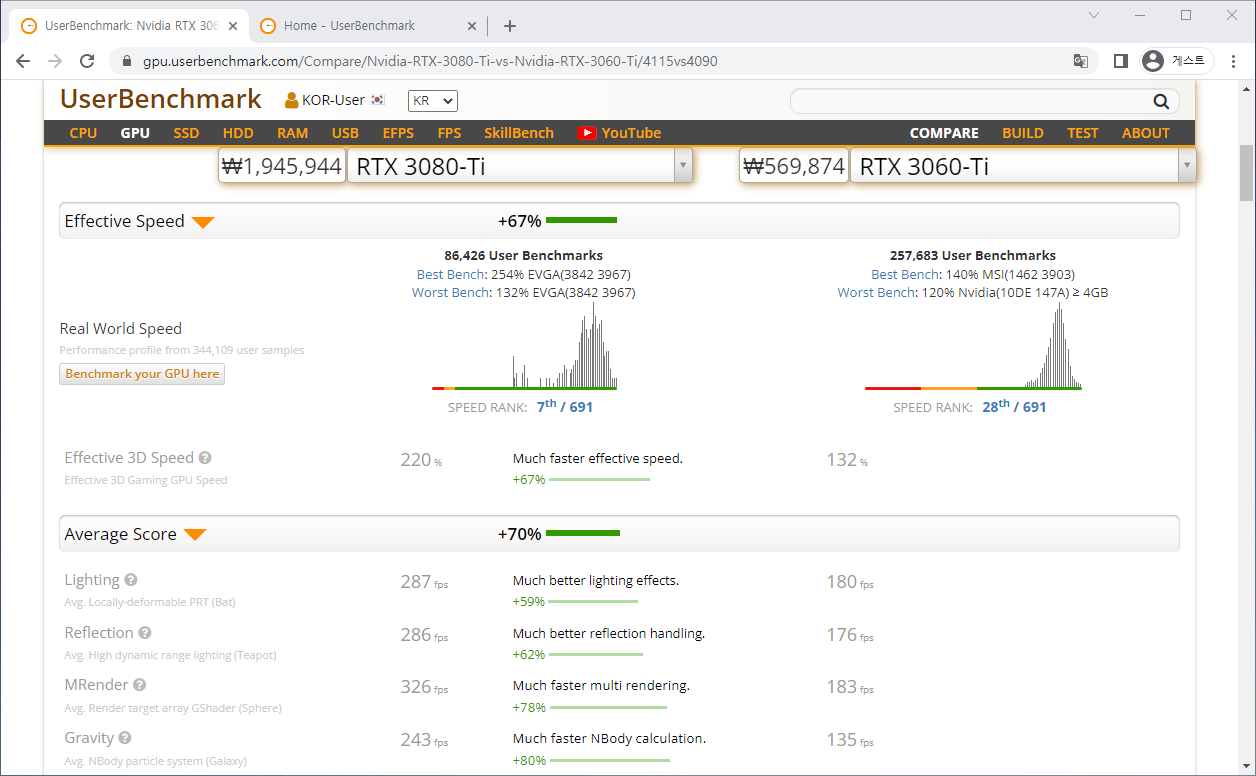 두 번째론 UserBenchmark라는 사이트다. 위에 사이트를 알기 전까지는 항상 아래 사이트에서 비교했으며, 쉬운 UI로 빠르게 비교해볼 수 있는 장점이 있다.